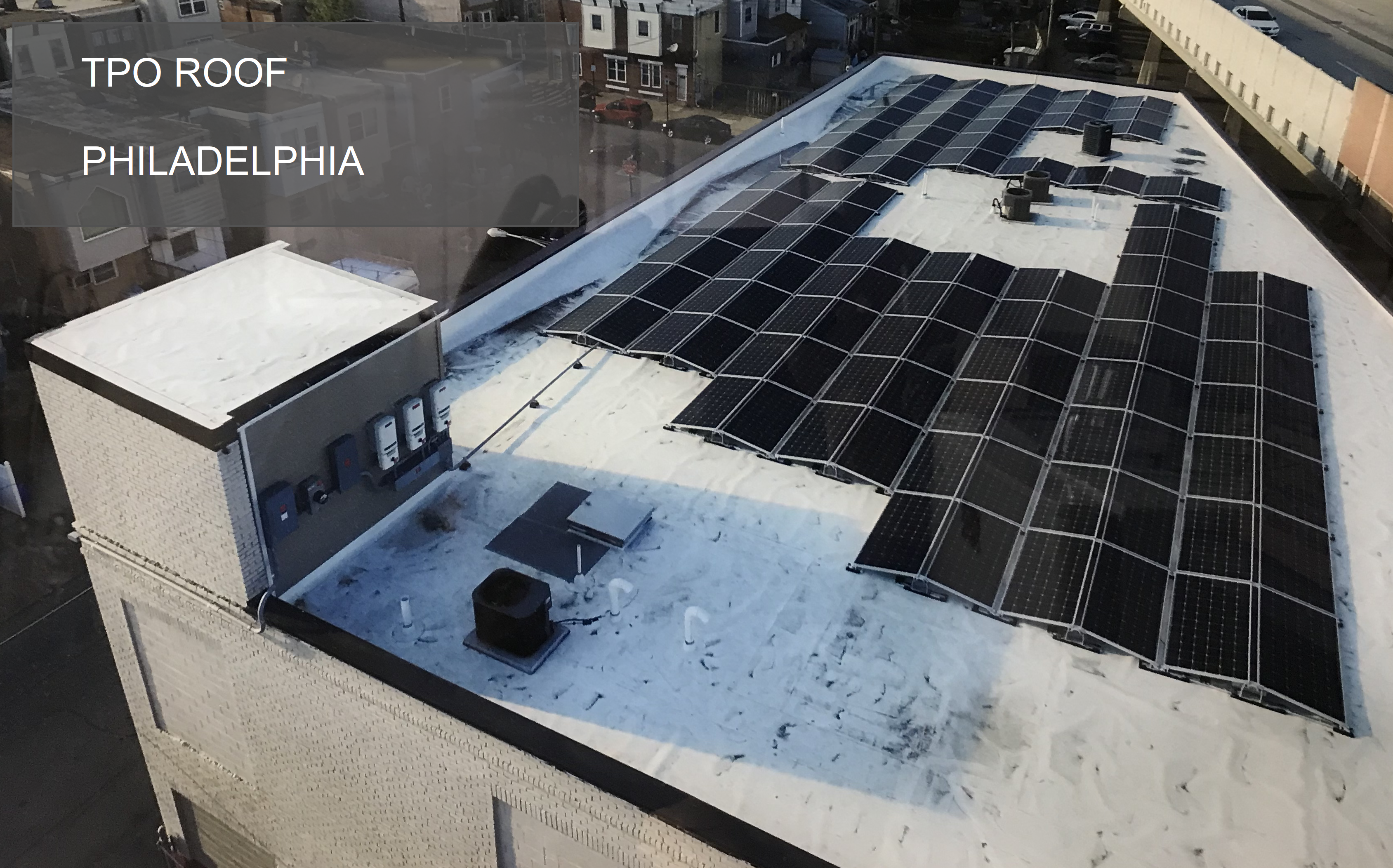 GP Martini went to GAF for a custom design that would allow a 20 year NDL warranty using .050 Everguard Extreme TPO system, with solar arrays placed right on the surface. GAF specified a multiple inspections during and after installation to ensure that the roof system would perform properly even with the large amount of foot traffic associated with installation of the solar panel system. The roof has performed nicely and the solar arrays are generating plenty of power to keep Mr. Knight in comfort and profit.