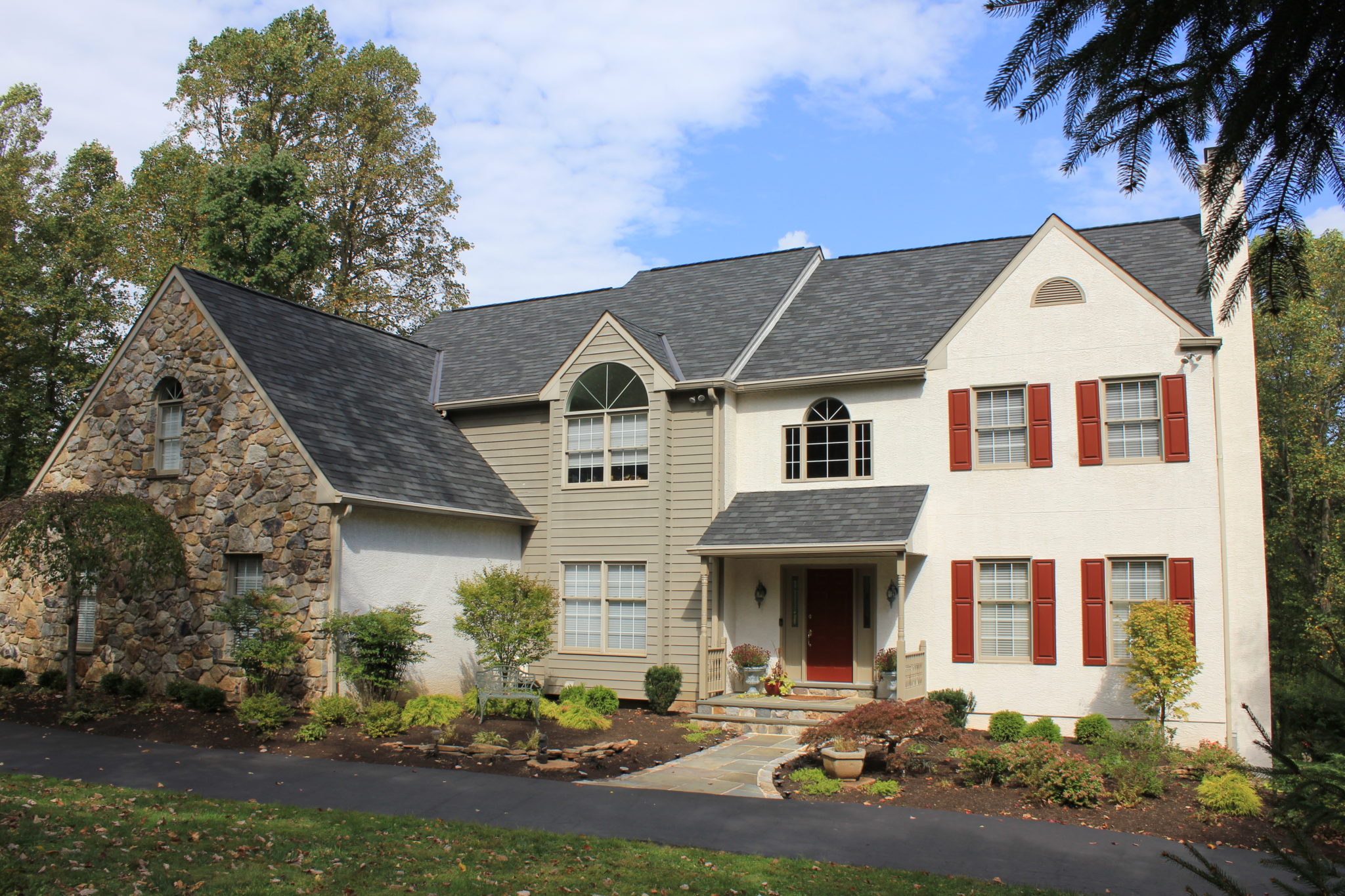 A beige and stone house with a dark grey shingle roof.
